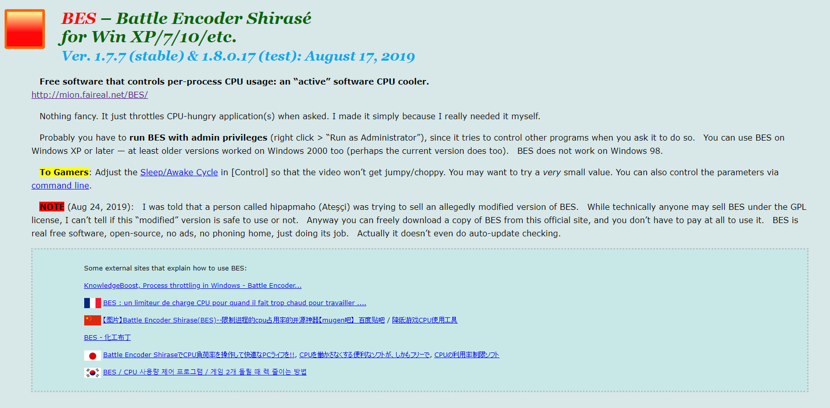 Thumbnail YouTube Facebook . BES? CPU 제어? 목차 ▣ B.E.S? ▣ Download ▣ Usage B.E.S? battle encoder shirase 의 약자로 B.E.S 라고 부르며 해당 프로그램을 이용해서 특정 프로그램(프로세스)에게 할당한..
