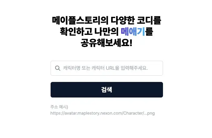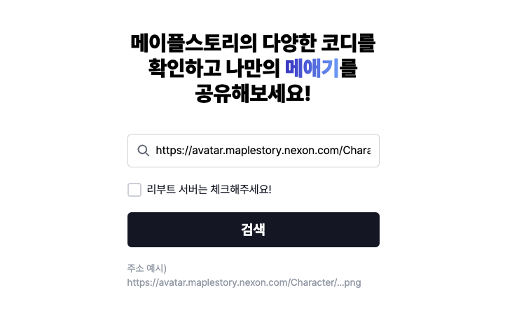 메이플 커마의 메인페이지에 있는 입력창에 아바타 주소 붙여넣기 후 검색을 누르면