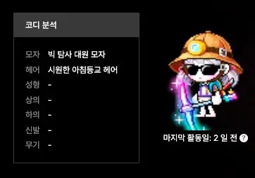 메이플 지지에서는 표기되는 부위가 총 7부위 입니다. 위 캐릭터의 경우 모자와 헤어 총 2가지 부위 밖에 역산되지 않았습니다.