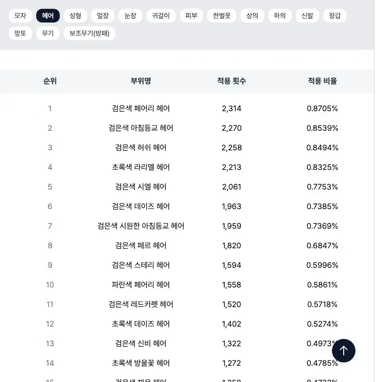 총 15부위에 대한 적용 비율과 횟수에 대한 통계치이며, 이 통계 수치는 메이플 커마에 등록된 캐릭터들의 정보를 기반으로 집계 및 산출되었습니다.