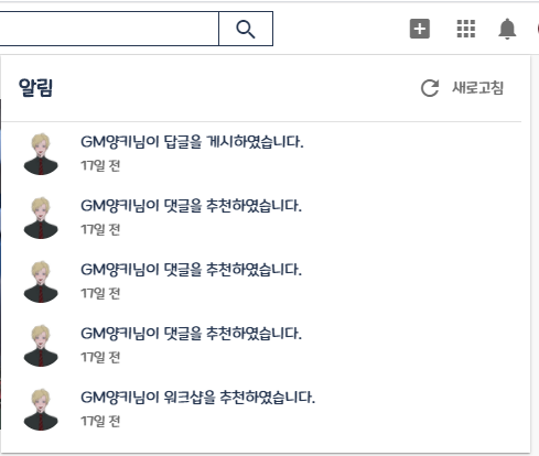 이에 댓글 작성시 해당 부모 댓글의 작성자 또는 게시글 작성자에게 서비스내 알림 아이콘을 통해 알림이 제공됩니다.