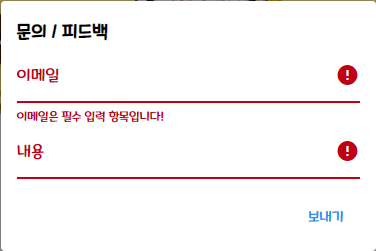 - 문의 및 피드백을 주신다면 서비스내 하단(푸터)에서 문의를 클릭하실 경우 Dialog(다이얼로그)가 나타나며 양식에 맞게 제출해주시면 감사합니다.
