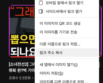 썸네일 추출을 하고자 하는 영상을 우클릭해서 주소를 복사하거나