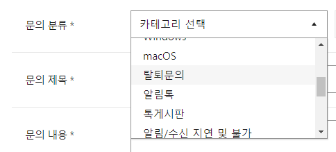 문의 분류를 '탈퇴문의' 로 선택합니다.