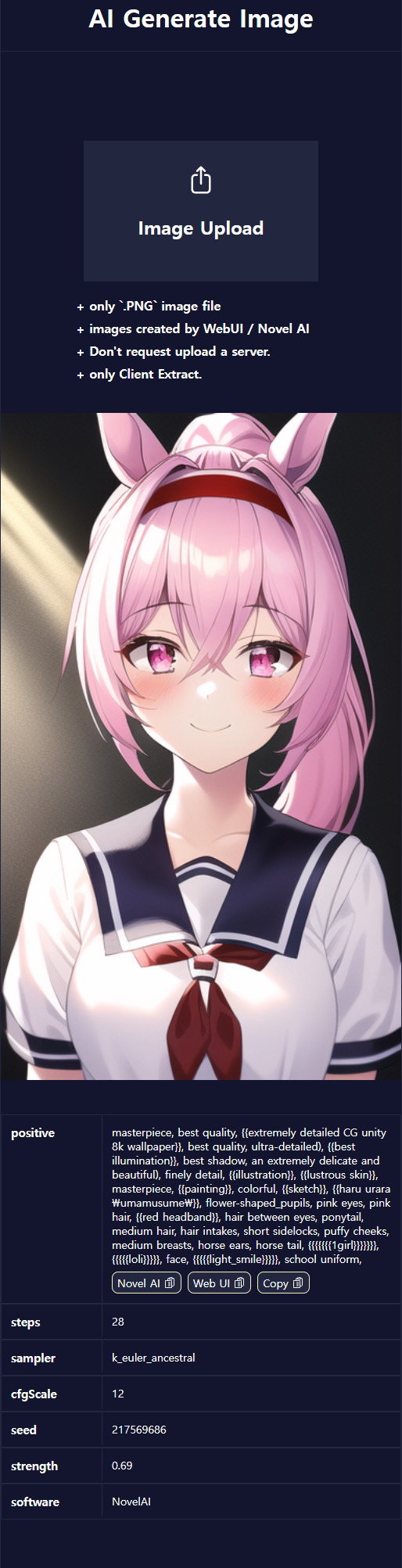 NAI(novel ai) 또는 Web UI로 생성한 PNG 이미지를 업로드하면 즉시, 서버를 거치지 않고 오직 브라우저 상에서 이미지를 분석하고 정보를 추출해냅니다.