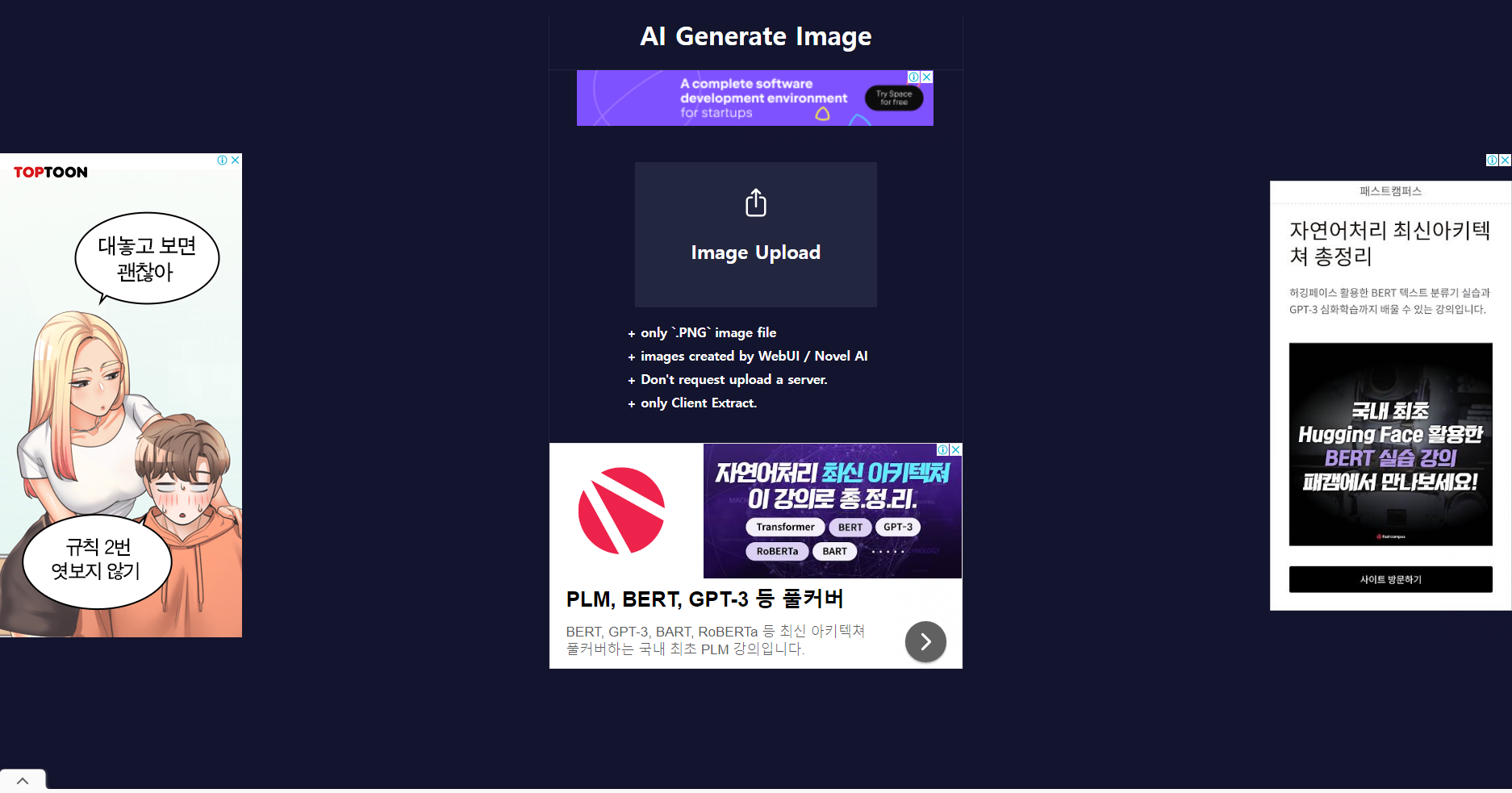 서버를 거치지 않고, 오직 클라이언트 JavaScript만을 사용하여, 이미지내에서 프롬프트를 추출하는 서비스를 만들게되어 공개합니다.