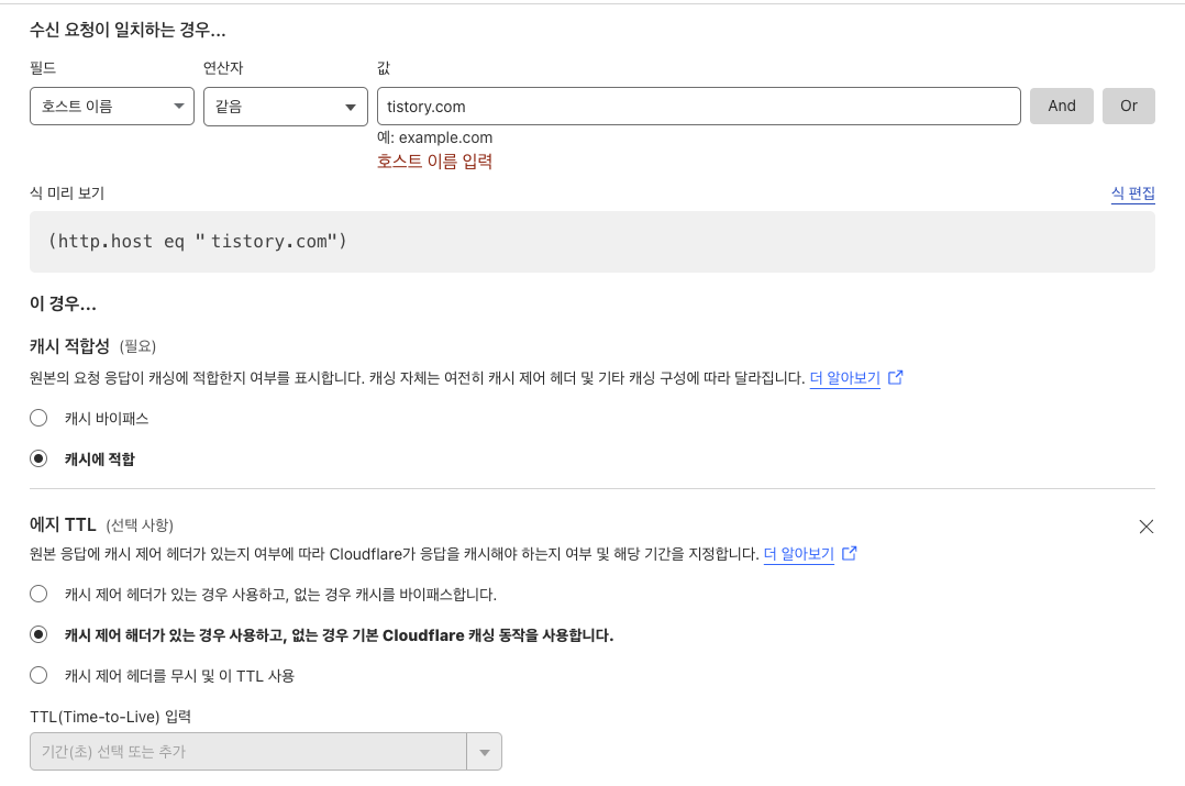 에지 TTL -> 캐시 제어 헤더가 있는 경우 사용하고, 없는 경우 기본 Cloudflare 캐싱 동작을 사용합니다.