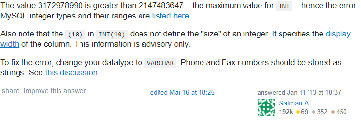 As I SET cust_fax in a table in MySQL like this: cust_fax integer(10) NOT NULL, and then I insert value like this: INSERT INTO database values ('3172978990'); but then it say `error 1264` o...