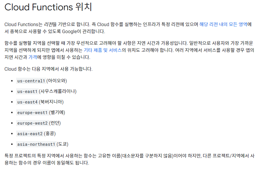 2020.03에 서울 리전이 등장하였지만 아직 Cloud Functions에서는 도입하지 못하고 제 기억으론 Cloud SQL 정도는 가능한 걸로 알고 있습니다. App Engine도 아직(2020.03.29 기준) 안됩니다.