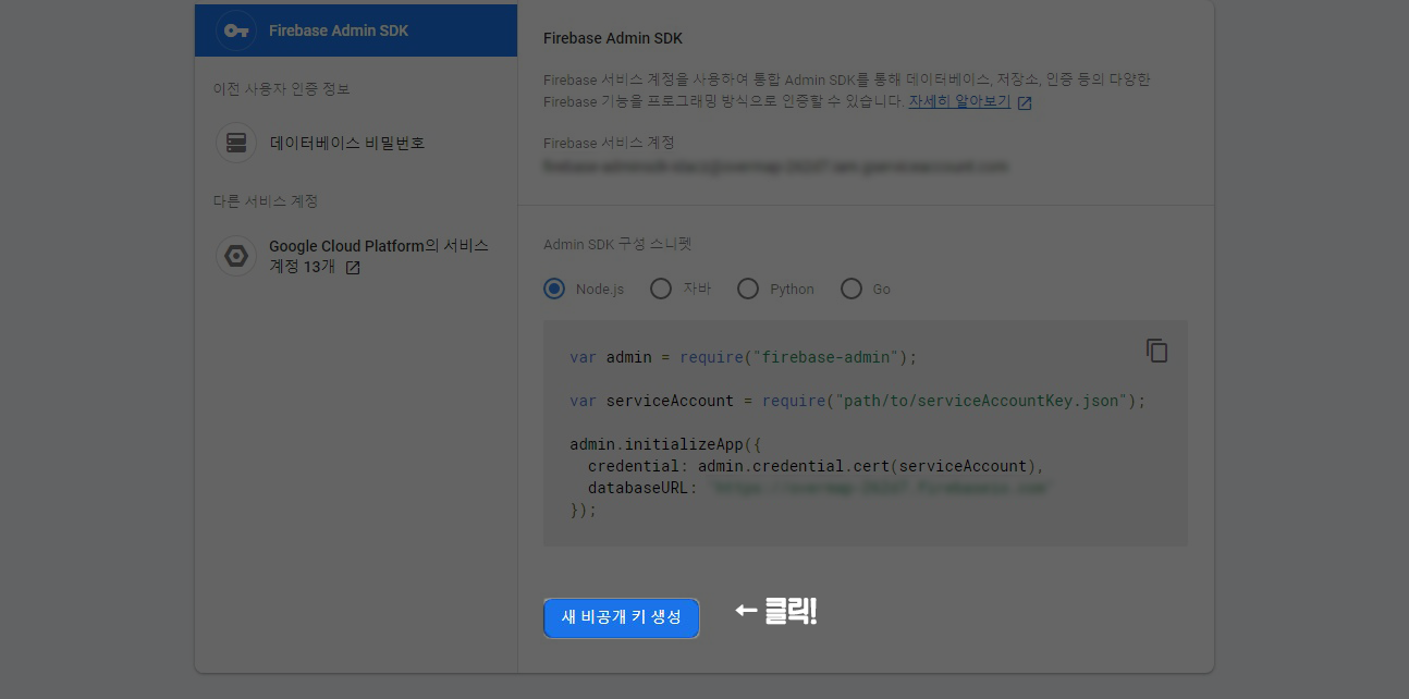 프로젝트 설정에서 서비스 계정 탭으로 이동하시면