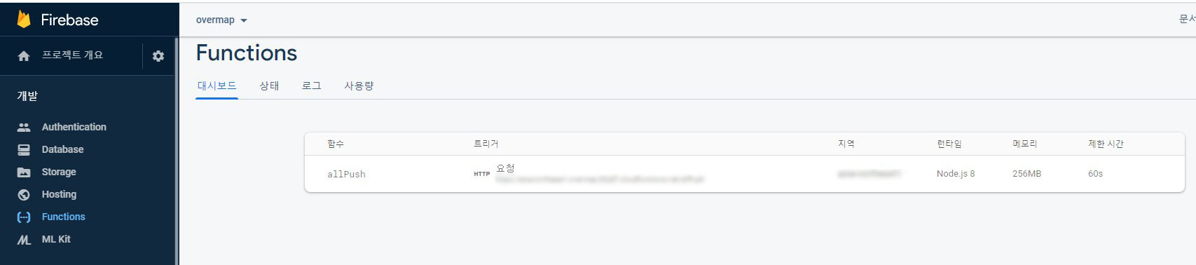 이제 Firebase에서 Functions 메뉴에서 대시보드를 보시면