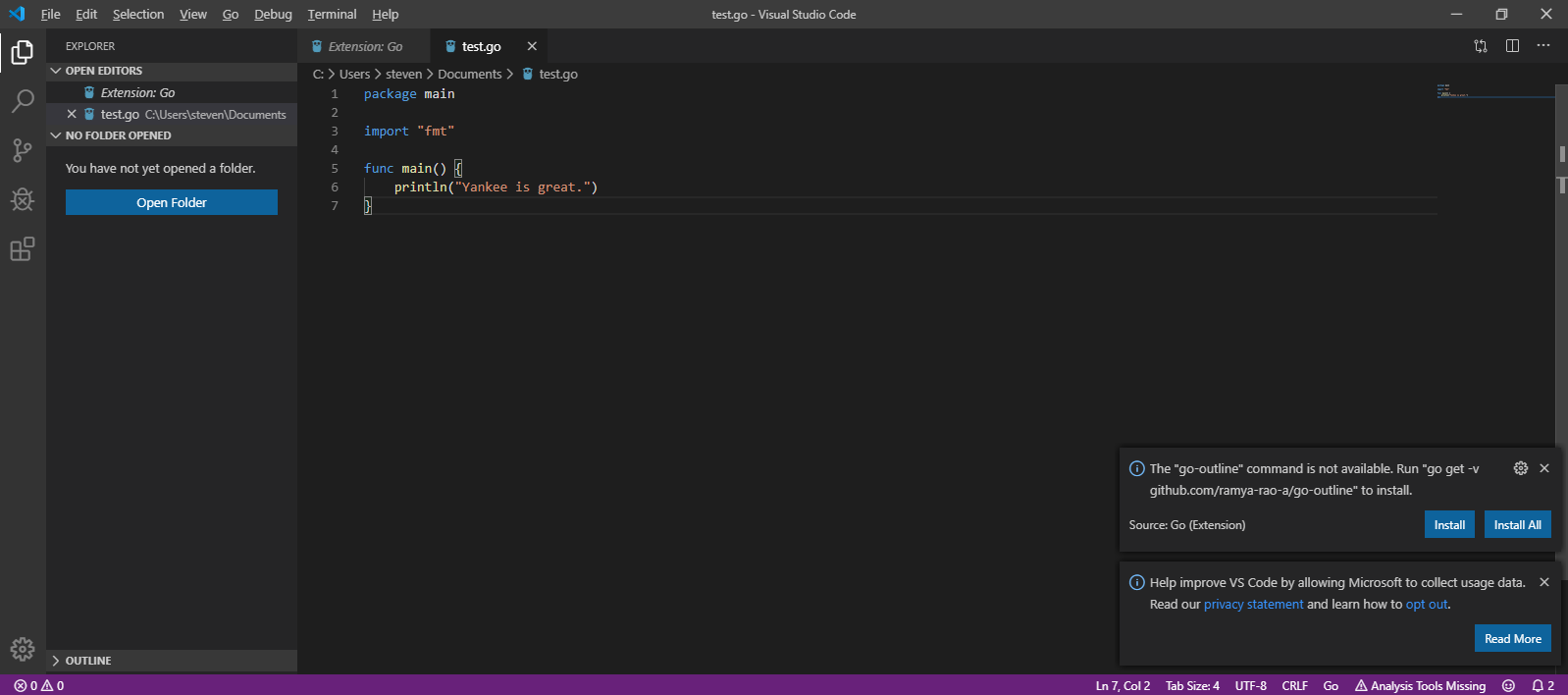 우측 하단에 보면 위와 같은 창이 떠있는데 Install All을 해주셔야 go를 실행할 수 있습니다.