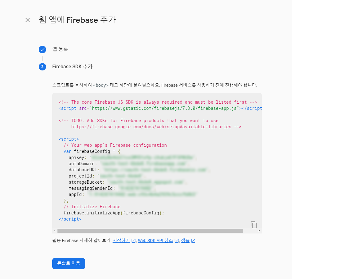 추가를 눌러주면 정말 Firebase 페이지 내에서 할 행위는 끝입니다.