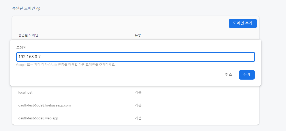 localhost나 로컬 내 또는 가상머신 등을 사용중이라면 하단의 승인된 도메인에 추가하여야 합니다.