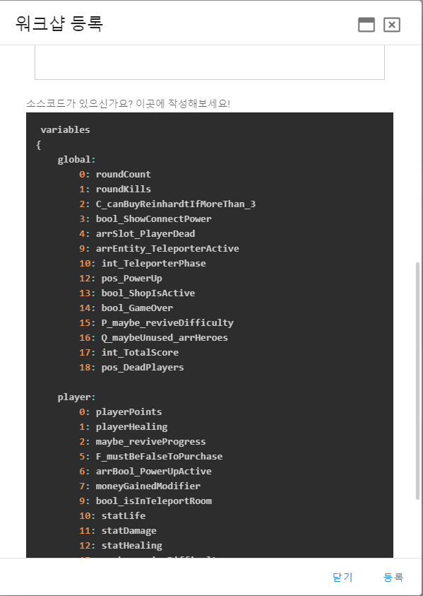 - 많은 워크샵 개발자 분들의 개발된 스크립트 공유 코드는 워크샵을 통해 공유되지만, 오버워치 중앙 서버에서 최대 6개월밖에 보존해주지 않아, 이를 해결할 방안으로 OVERMAP에서는 코드 등록 시 실제 스크립트 소스코드를 저장할 수 있는 방안을 추가하였습니다.