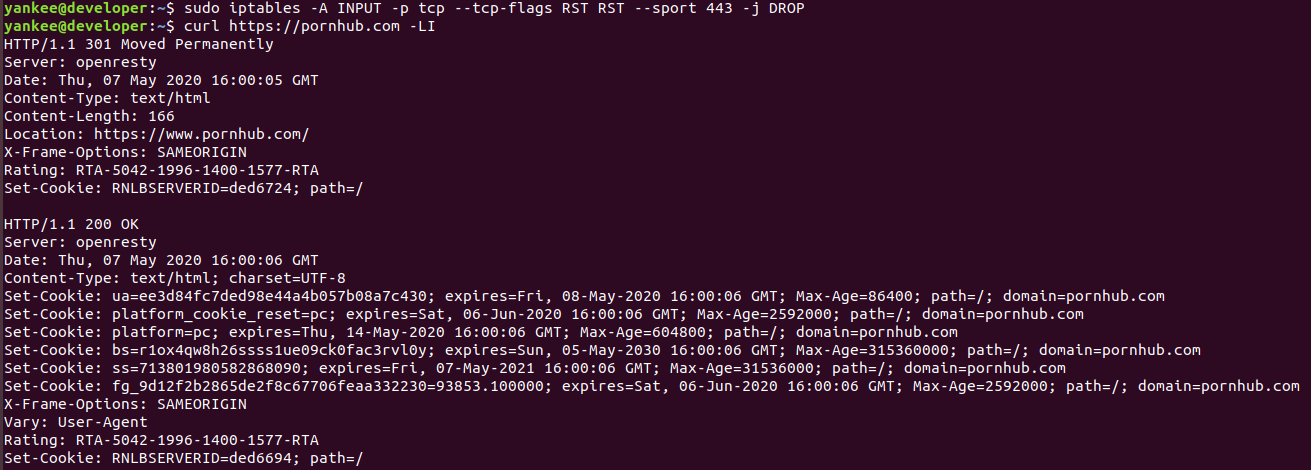 sudo iptables -A INPUT -p tcp --tcp-flags RST RST --sport 443 -j DROP curl https://pornhub.com -LI