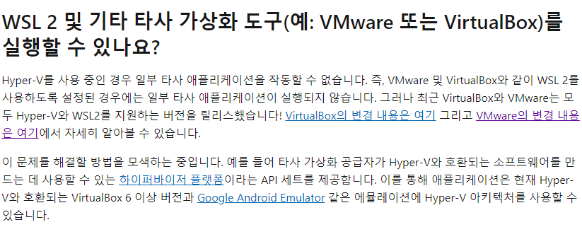 많은 화제가 일어나고 있는데, 기존에는 WSL과 VMware 혹은 VirtualBox 그리고 Android Emulator(안드로이드 에뮬레이터)등 VT-X 기술을 사용하는 제품(소프트웨어)들을 사용할 수 없었는데
