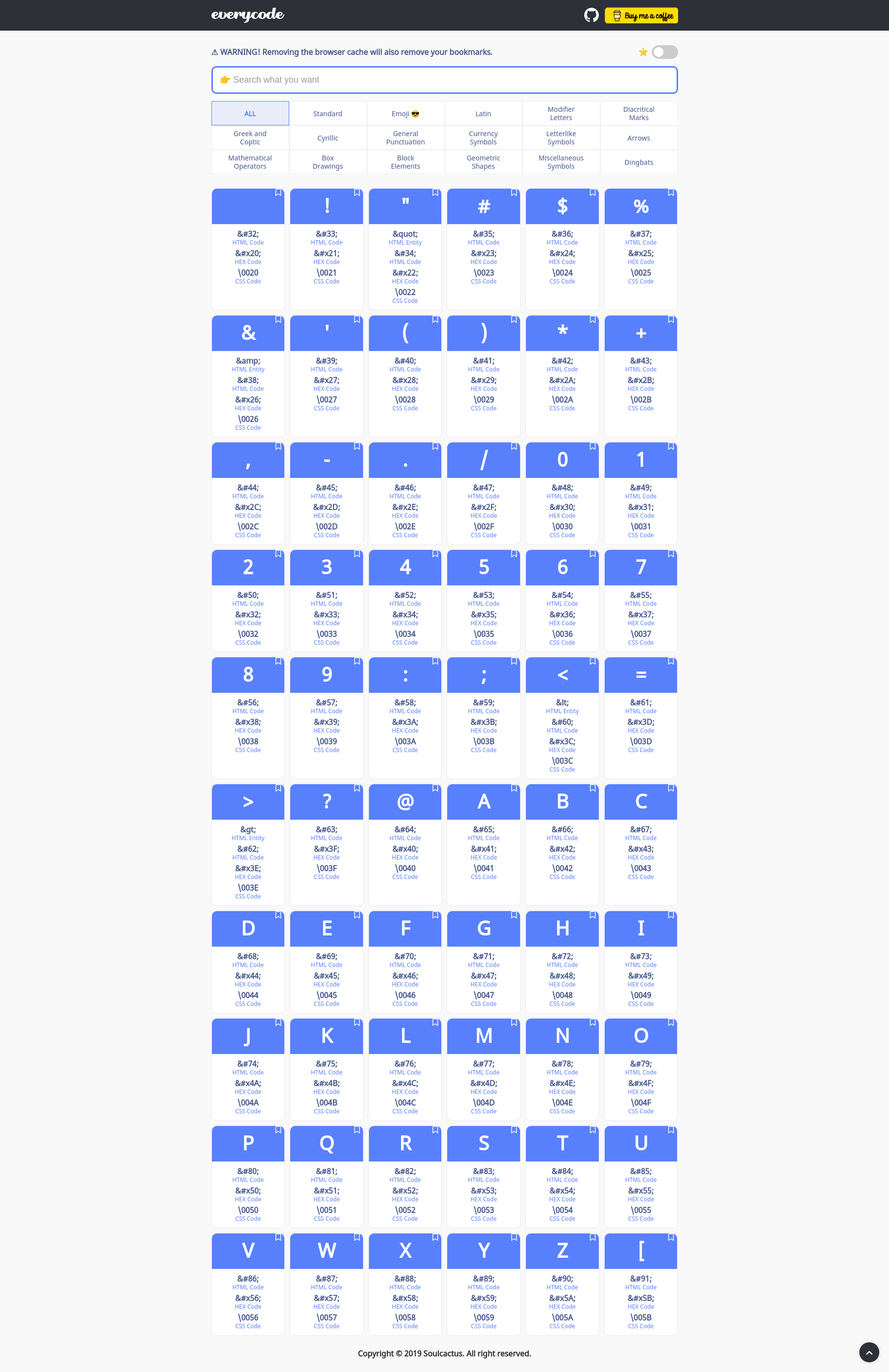 EVERYCODE 라는 곳 인데, 각 문자 표 마다, HTML / HEX / CSS 순으로 모두 표기해주고 있네요