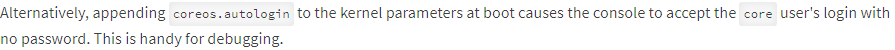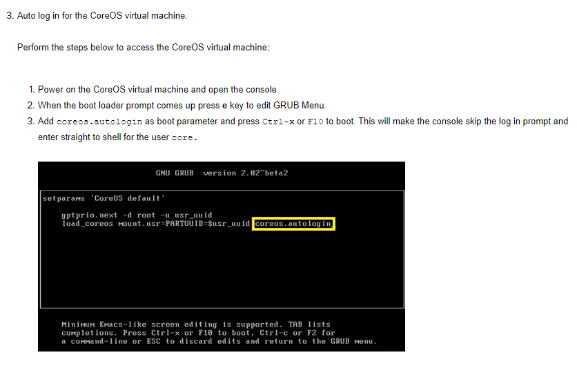 기존 리눅스를 사용하던 것 처럼 GRUB 부트로더에서 키보드 'E' 를 눌러 Editor 모드로 접근해서 젤 하단 뒷 부분에 coreos.autologin 을 작성해주시면 됩니다.